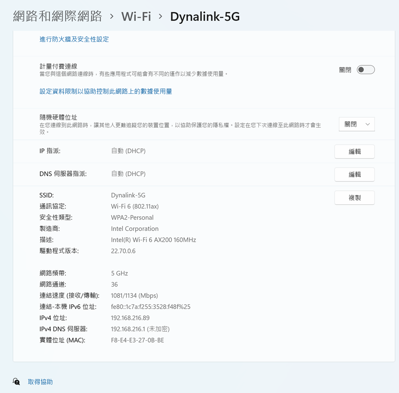 同時也可以注意右上角的 Wi-Fi 連現有顯示 Wi-Fi 6 最新的無線連線標準!