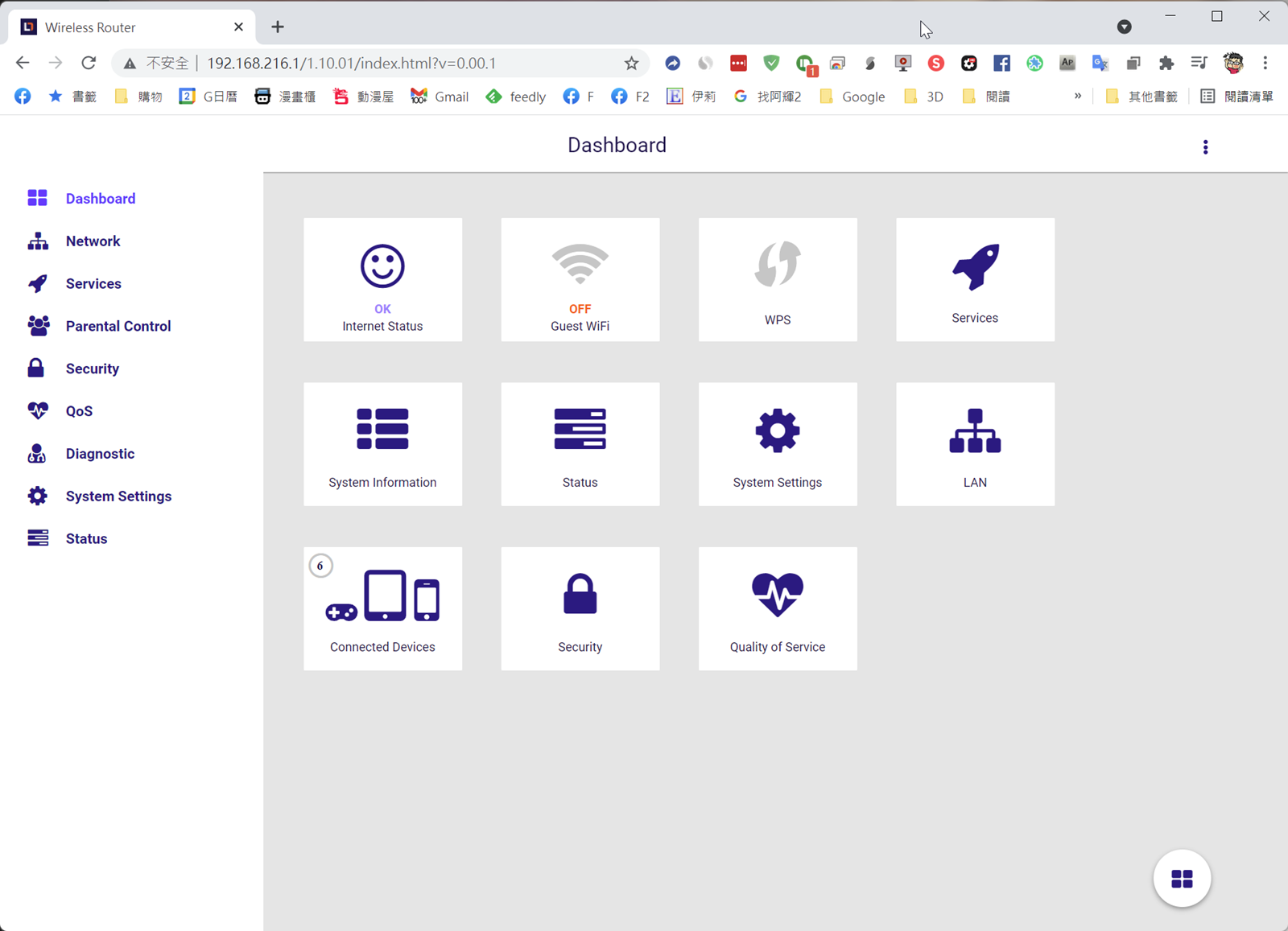 需要進階功能的話也可以使用 Web 介面在瀏覽器中進行操作,使用 Web 瀏覽器打開預設路由器首頁 http://192.168.216.1 進入即可進入 Dynalink DL-WRX36 AX3600 路由器的設定頁面。