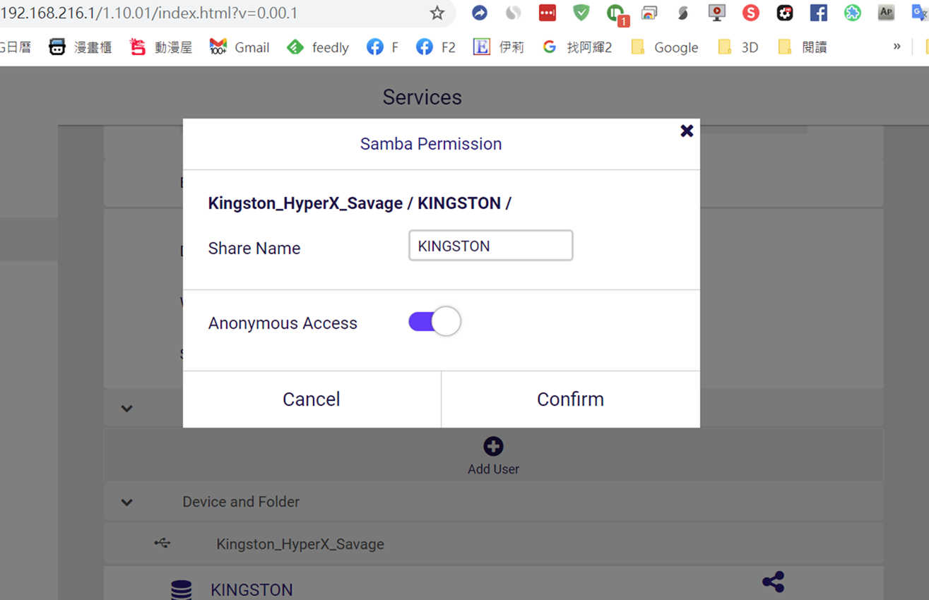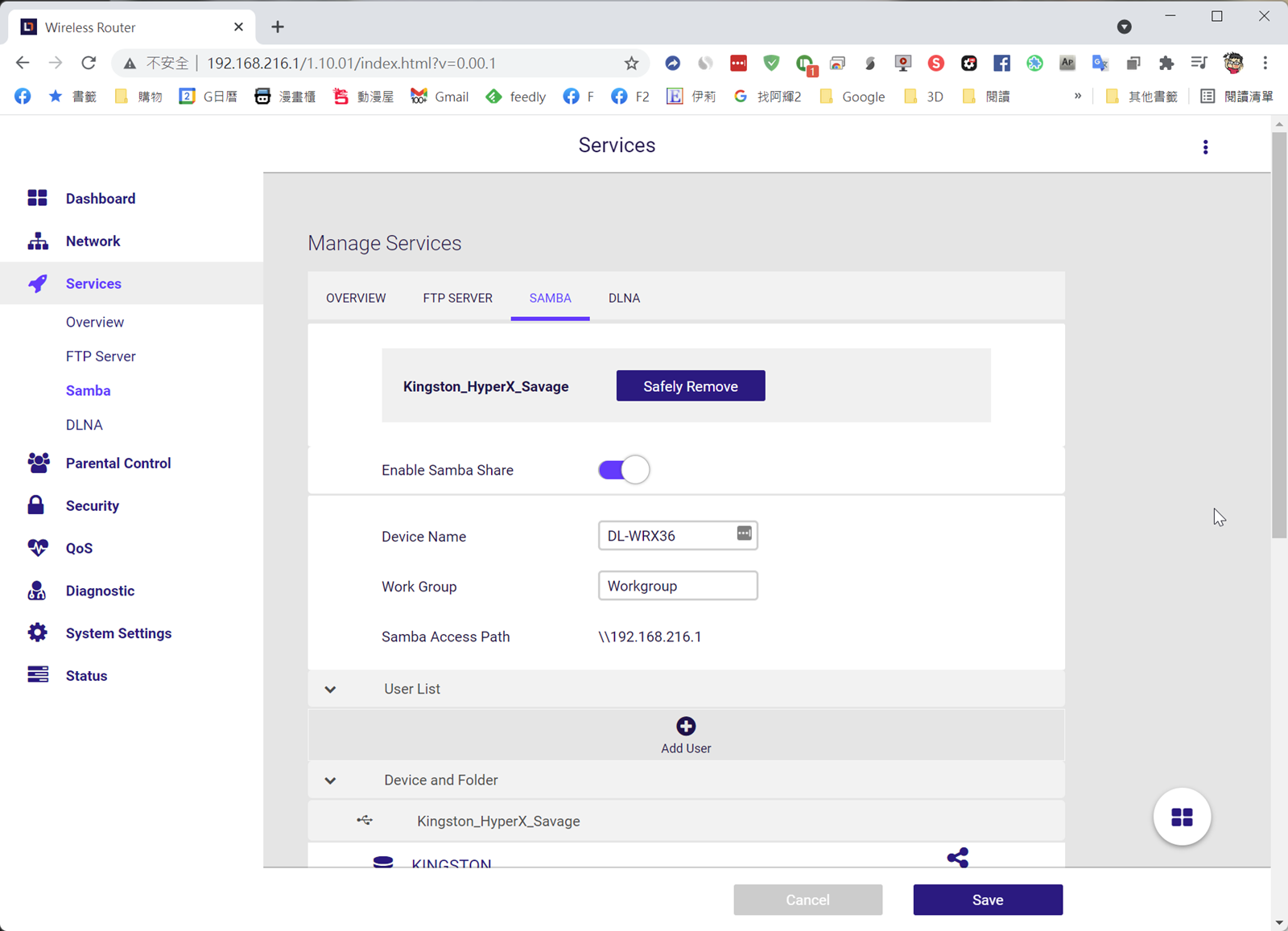 前面有提到Dynalink DL-WRX36 AX3600 上有支援 USB 3.0 隨身碟的接能力,插入 USB 外接硬碟或是隨身碟的話就可以在 USB 分享中看到設備與設定選項。