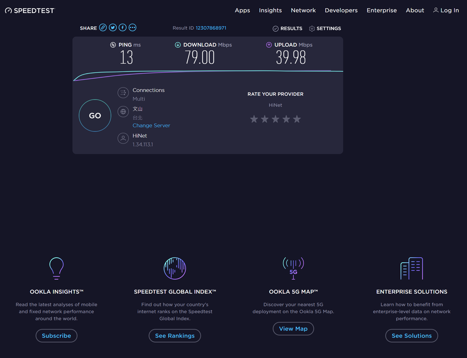 直接來實測一下上下傳速度,要說一下阿輝家裡是光世代 100/40 線路,不過因為是老舊公寓,實際上速度大概就是 80/40 就是極限了,這也可以說 Dynalink DL-WRX36 AX3600 的連線能力與速度完全高於阿輝家中的光世代線路啊啊啊(好想要升級 300M 光世代…)