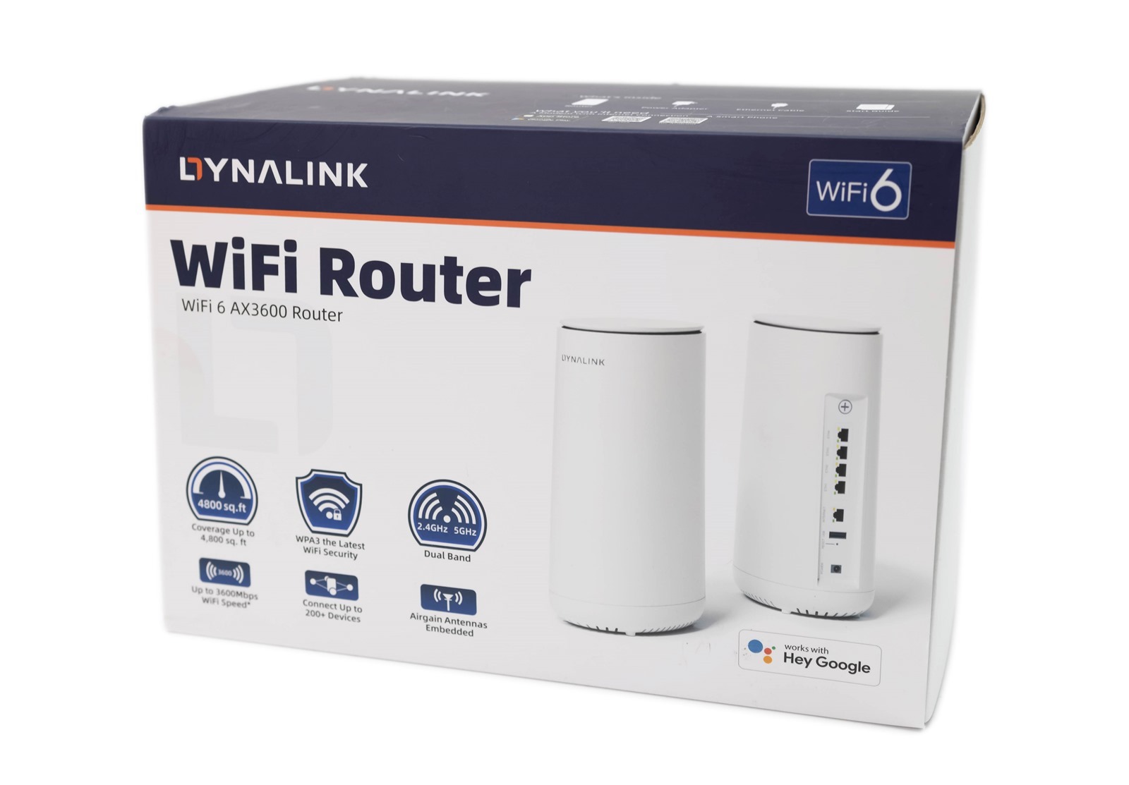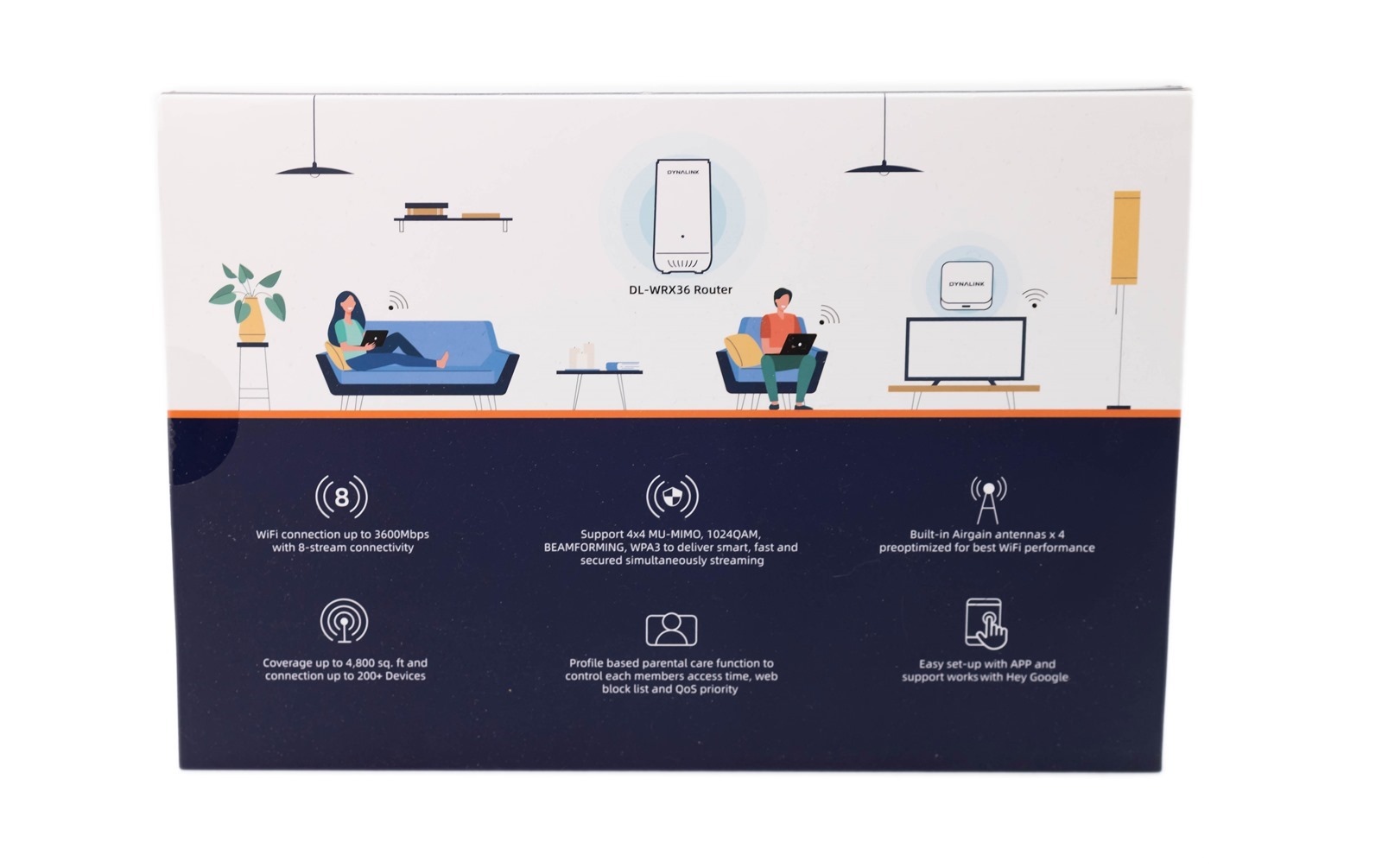我們邊開箱邊介紹 Dynalink DL-WRX36 吧!包裝盒上直接就清楚明瞭的告訴大家 Dynalink DL-WRX36 的優點有哪些,簡潔的產品照片當然一定要的,支援 WPA3 最新安全標準、 2.4GHz/5GHz 雙頻、最高支援 3600Mbps 高速網路連線頻寬、支援高過 200 台以上設備連線、 Airgain 內嵌隱藏式全向式天線等等產品特點,右下角的 works with Hey Google 也直接告訴大家它支援 Google 語音助理!