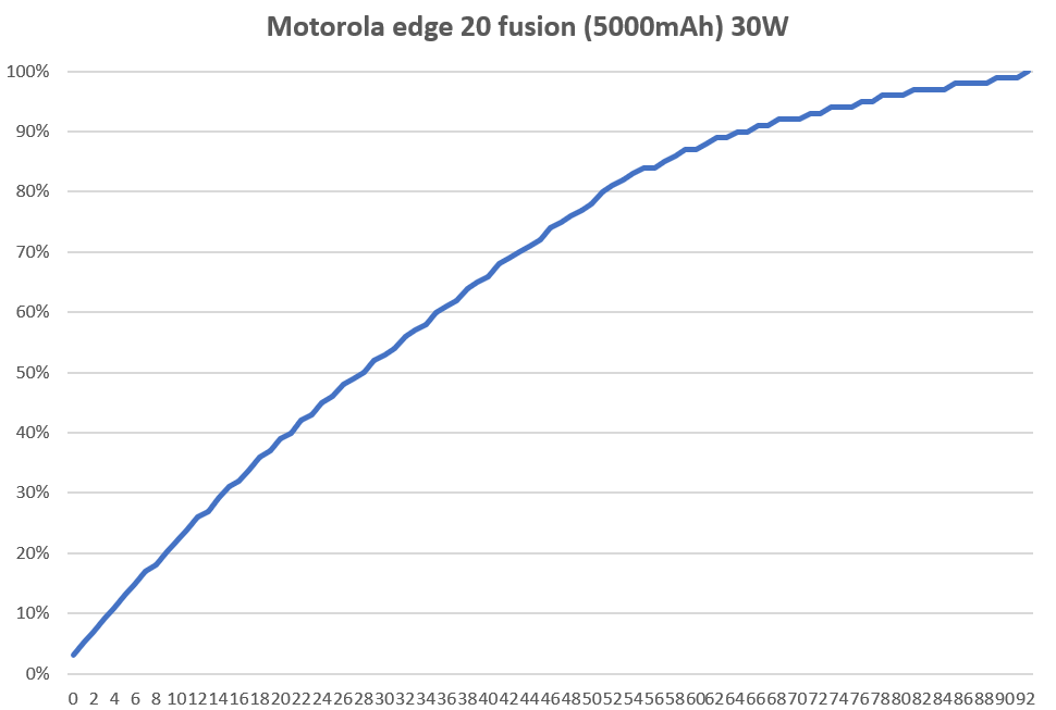 edge 20 fusion 充電部份支援 30W 充電,這裡我們將機器消耗到自動關機,接上原廠充電器與原廠線材開機充電(待機狀態),並觀察紀錄充電實際的速度與時間。
