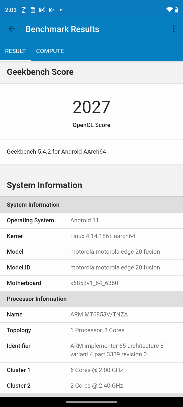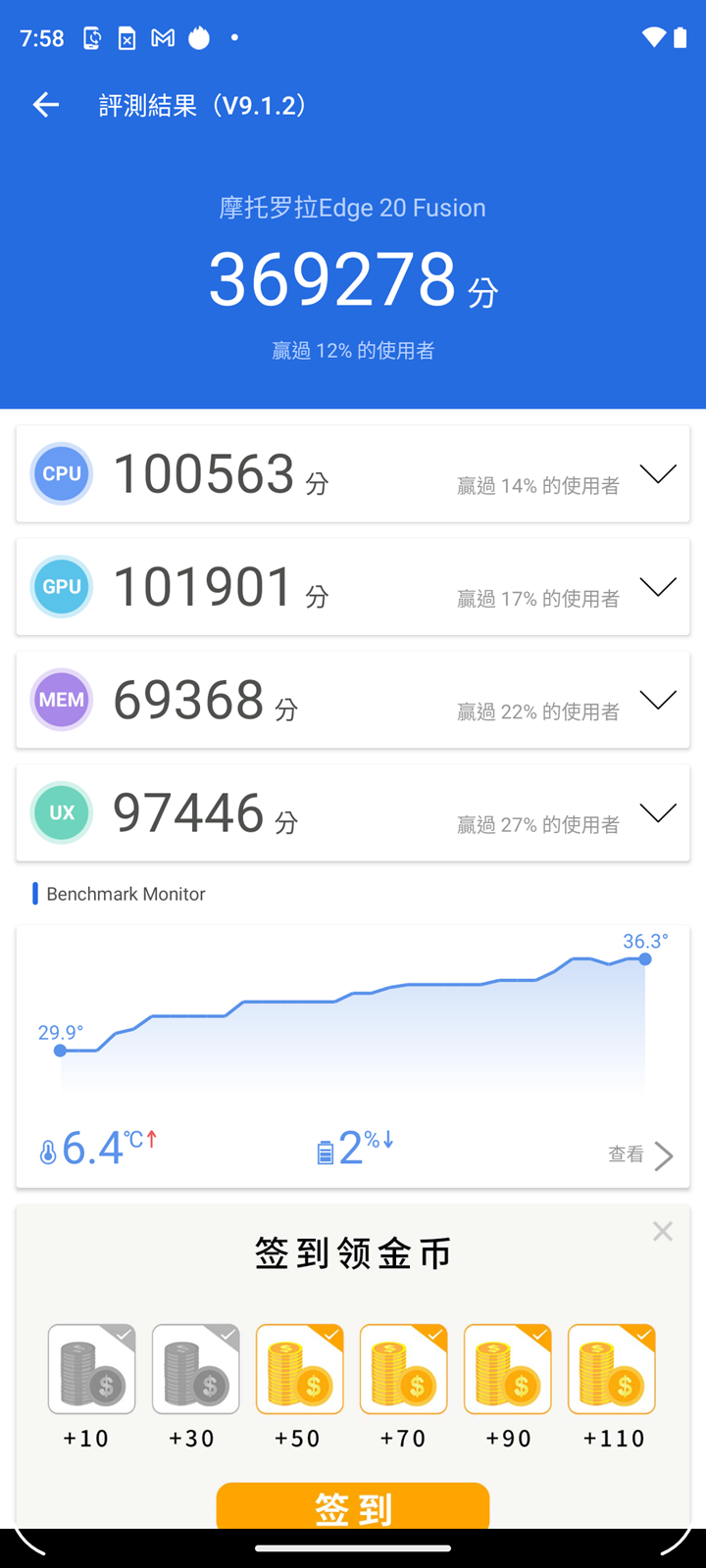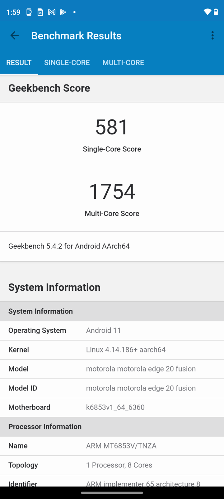 edge 20 fusion 採用 MTK 天璣 800U 處理器與 8GB 內建記憶體的規格配置,更多資料也可以阿輝資料庫 https://reurl.cc/MxdjK 內有大量阿輝多年測試手機/平板的實測數據,可以給大家作為對照參考使用。