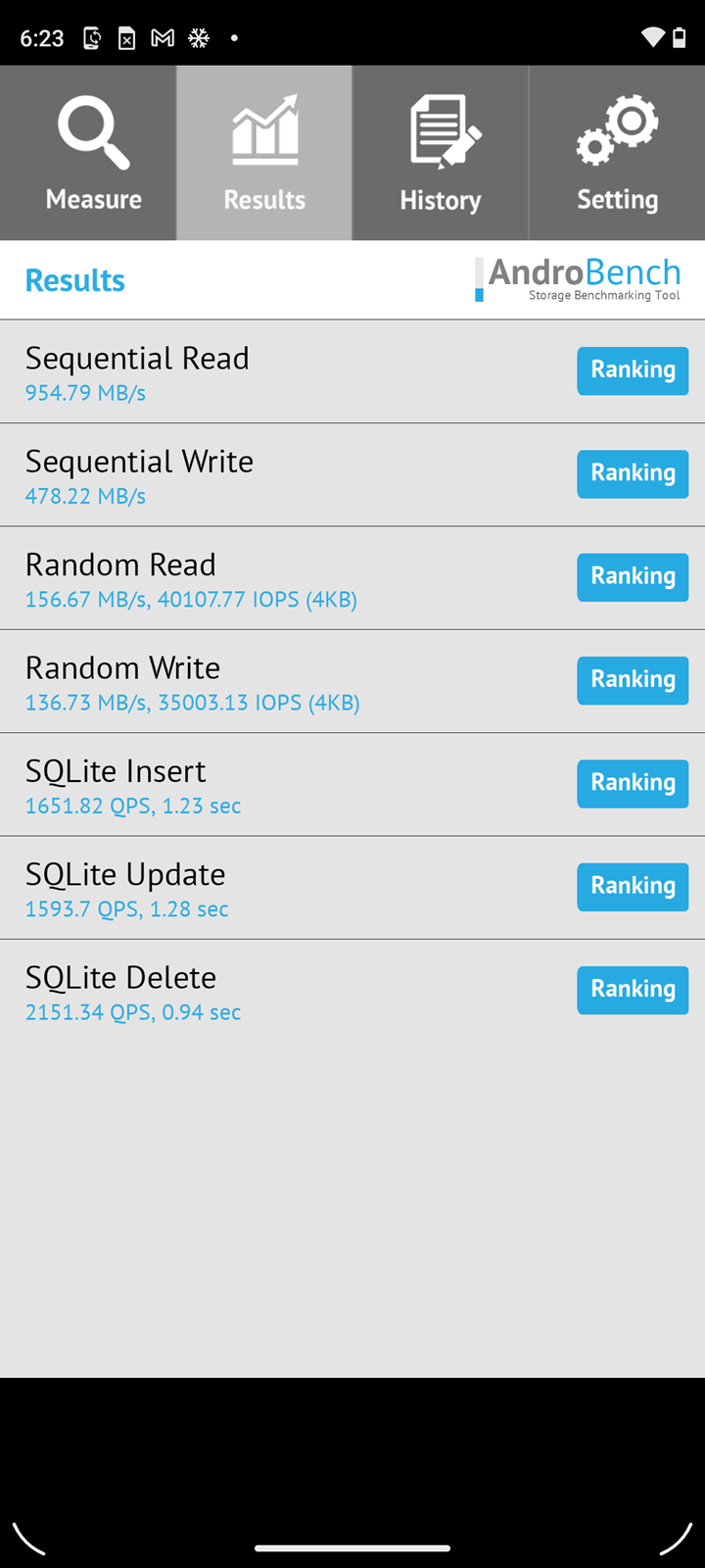 其實除了 CPU 處理器與記憶體,內建儲存空間的讀取/寫入速度也非常影響到日常使用的順暢度,這裡使用 AndroBench 實測讀寫速度,測得的結果為讀取 954 MB/sec MB,寫入為 478 MB/sec