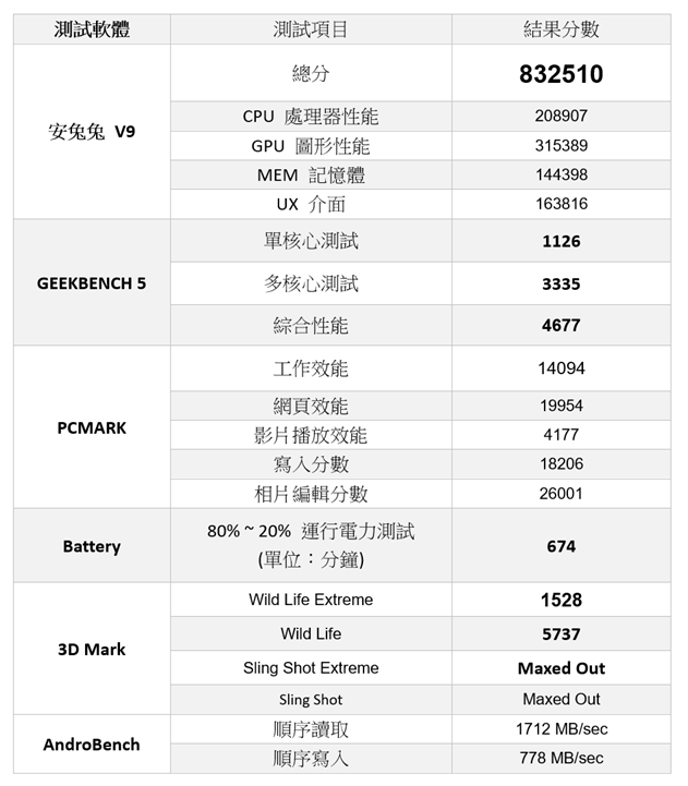 其實除了 CPU 處理器與記憶體,內建儲存空間的讀取/寫入速度也非常影響到日常使用的順暢度,這裡使用 AndroBench 實測讀寫速度,測得的結果為讀取 1712 MB/sec MB,寫入為 778 MB/sec