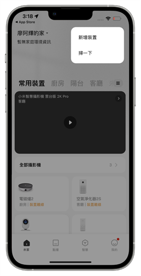 做為一台具有 5G IoT 物聯網功能的掃地機器人,當然也能使用米家的程式來統合管理它,不管是 google play 還是 iOS 系統都能夠找到米家的應用程式;阿輝家中的米家電器也是不知凡幾,平常就有在使用米家 APP 管理家電。新增雲米 Alpha2 Max 到米家 APP 中的方法也相當簡單,只要在右上角點一下新增裝置,然後在同時按住掃地機器人的 HOME 鍵和開關鍵 3 秒,接著聽到掃地機器人發出語音提示後就可以進入配對模式,按下一步就可以準備連接。