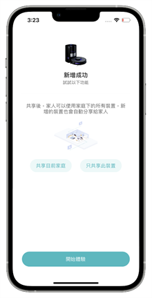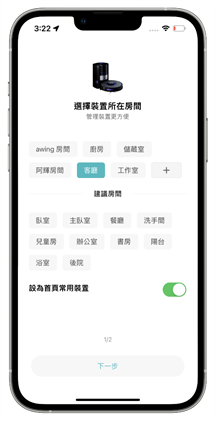 配對成功後就會在 APP 中看到雲米 Alpha2 Max 的圖示顯示在 APP 中,再來可以選擇掃地機器人是放置在家中的什麼位置,阿輝一般都是把掃地機器人放置在客廳這個最常有活動的空間、也是最主要需要打掃的空間,大家可以依照自己的情況去做標示;新增成功之後還可以與家人共享裝置的管理權限,可以分享整個家庭的電器管理,也可以單一只分享其中一個裝置。基礎的裝置管理權限設置好了以後,APP 就會進入更新韌體的步驟。