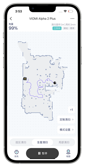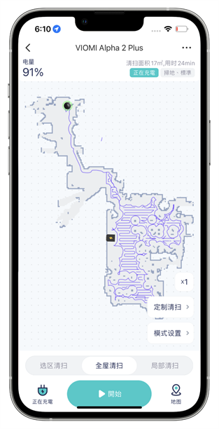 接著就可以開始讓掃地機器人進行一次的全屋清潔來繪置地圖囉,在 APP 的左上方可以看到掃地機器人目前的電量、右上方則可以看到目前的清掃面積、以及它是否在工作中,和它目前清潔的模式是什麼。