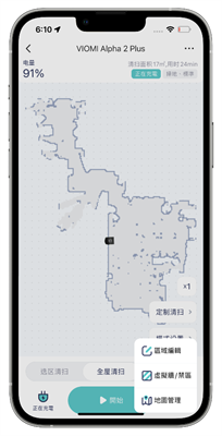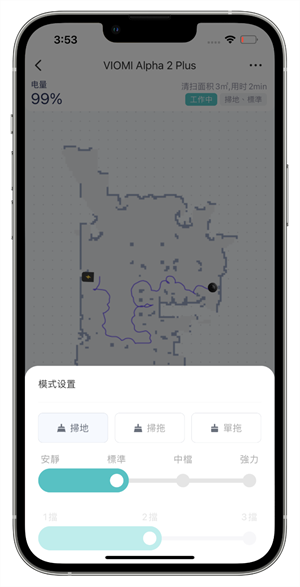 右下角的模式設置點開則可以設定掃地機器人做掃地、掃拖或單拖的清潔模式,包含吸力的部份也可以在此做調整,雲米 Alpha2 Max 的掃地模式提供了四檔段位的吸力模式、拖地則是提供了 3 個檔位的拖地模式可以做選擇;每個不同的房間也都可以各自設置預設不同的清潔模式,例如在電線電器較多的房間阿輝比較不需要拖地的模式,那就可以設定掃地機器人在清潔該房間的時候只使用掃地模式;或者在放置貓砂盆的房間裡需要更強力的吸力模式等等的細節,大家都可以依照自己的家中情況去做各自的細節設定。