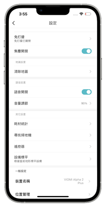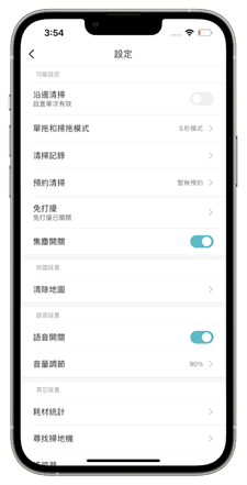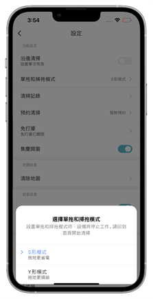 進入設定以後也還有更多的細節可以設定,例如開啟沿邊清掃只打掃家中角落較難清潔的地方,或者是在單拖和掃拖模式裡設定掃地機器人的移動模式,雲米 Alpha2 Max 則有提供了 S 形和 Y 形的兩種模式選擇,S 形使用在拖地時較省電、但是 Y 形則可以讓拖地清潔程度更加精細。其它也還有可以查看清潔紀錄、預約清掃、集塵和語音開關、語音聲量、耗材統計等等的小細節可以做設定。
