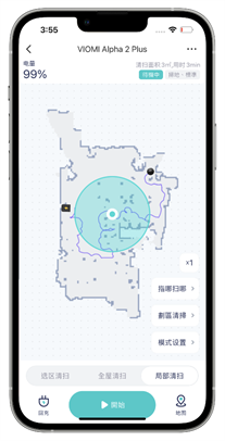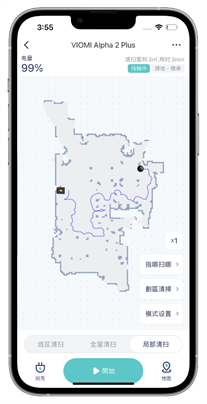 設定局部清潔的時候,可以透過 APP 中的指哪掃哪,或者是在地圖中畫一個範圍讓掃地機器人開始針對局部指定範圍做清潔,同步同樣也可以設定掃地或拖地或掃拖的執行模式,讓掃地機器人也能當突發狀況的好幫手,或者是阿輝做完模型後清理丟在地上廢料的清潔小精靈。