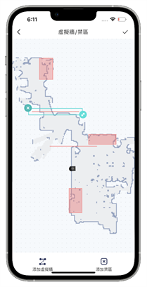 上點開 APP 右下方的地圖,則會出現區域編輯、虛擬牆/禁區、地圖管理的三個選項,大家也可以依照家中情況使用設定虛擬牆/禁區的功能去避開掃地機器人到有怕水或者是不需要清潔的地方,直接在地圖上劃設方塊或者是拉出一條線就可以做設定去限制掃地機器人的清潔範圍。