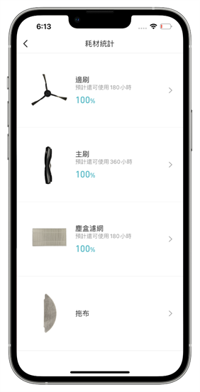 不在家的時候掃地機器人到底有沒有認真上班工作呢?打開清掃記錄就可以看到過去 30 天掃地機器人在什麼時候、做過哪些清潔清掃的記錄以及清潔的模式是什麼。耗材到底是不是到了該做替換的時間了呢?說明書的建議替換時間到底是多久總是搞不清楚,不小心弄丟了說明書、忘了是從什麼時候開始讓雲米 Alpha2 Max 進入到你的家庭生活裡的話也不必擔心,APP 裡的耗材統計幫你管理的一清二楚,預計還可以使用的時數都會幫你做提醒顯示,電子化的管理就是這麼的簡單又有效率。