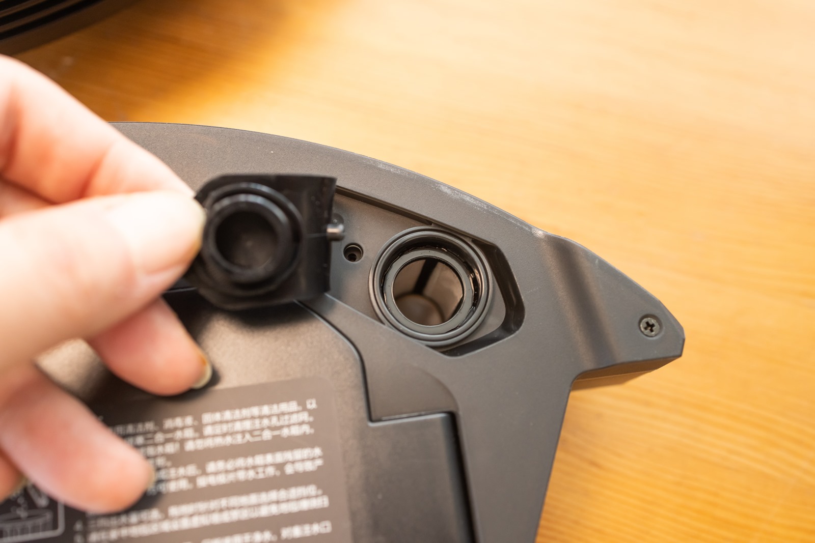 在這邊也可以看到隨附藏在機器中要用來清潔主刷用的清潔小刀,清潔小刀的另一頭矽膠蓋則是水箱的注水口,需要使用拖地功的時的水就從這個注水口加入,形狀還特地有做成跟清潔小刀相同對稱的樣子。雲米 Alpha2 Max 配備的是恆壓電控水箱,共提供有三檔出水量的檔位,並使用恆壓電控也讓水量不會噴出過多或過少,不會因為拖地之後在地板上留下水漬。