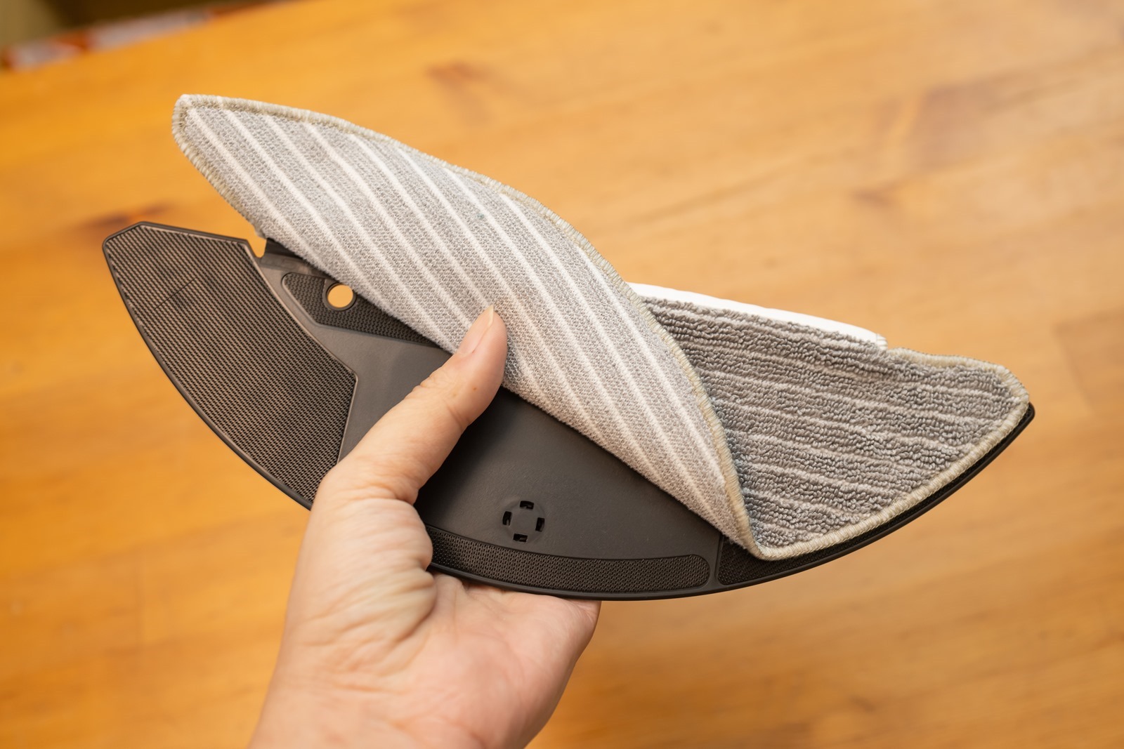 拖布安裝使用的方法非常簡單,把拖布支架從水箱移除後,把拖布靠上拖布支架就可以自動黏貼並輕鬆固定住,相信一個五歲的孩子也能做到這個簡單的動作,原廠也很貼心在隨附的時候也已經有一個已經安裝好的在上面了。
