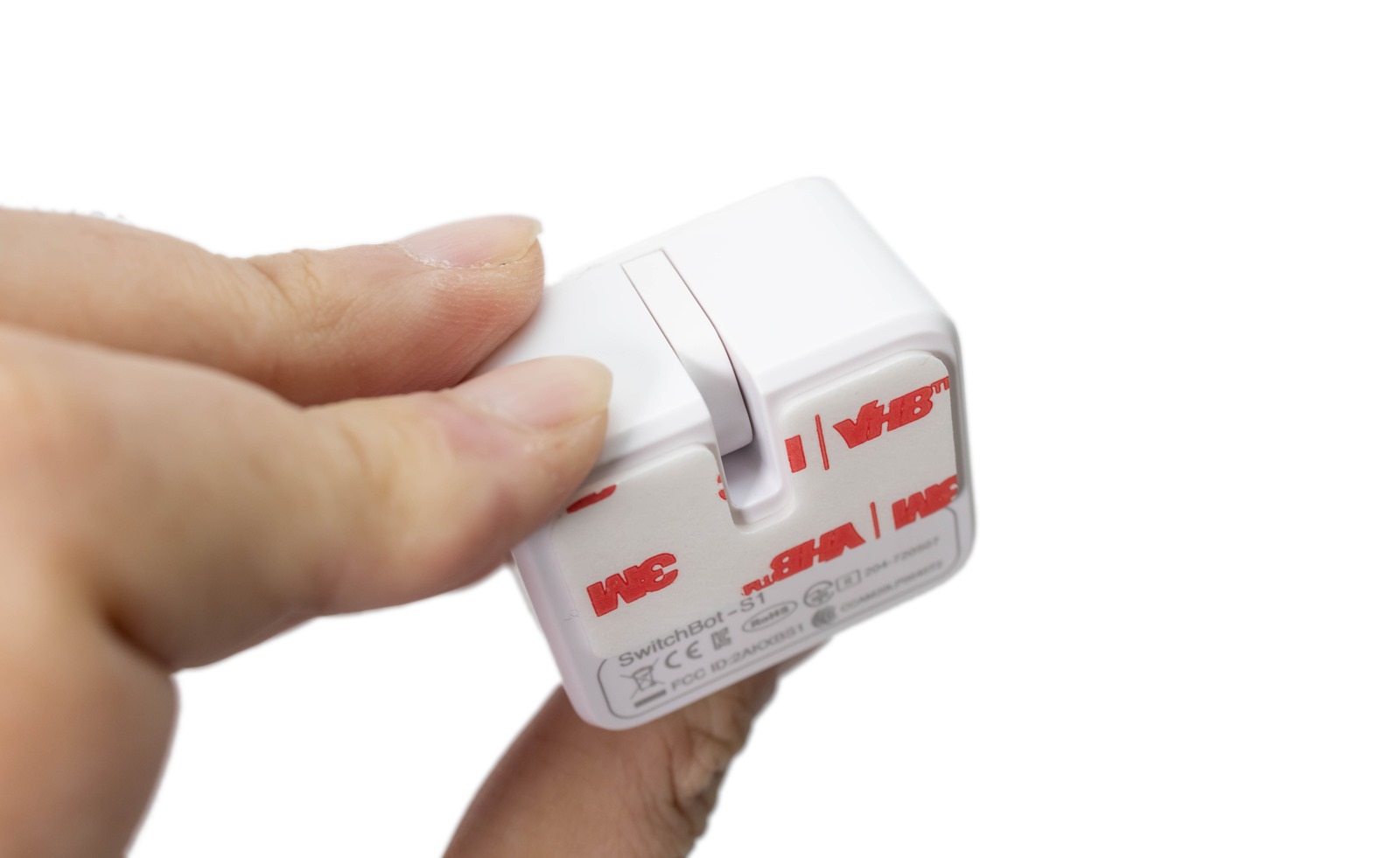 背後就是 3M 的背膠(包裝中有更換備品),這個角度也可以看到 SwitchBot Bot 巧妙的開關設計