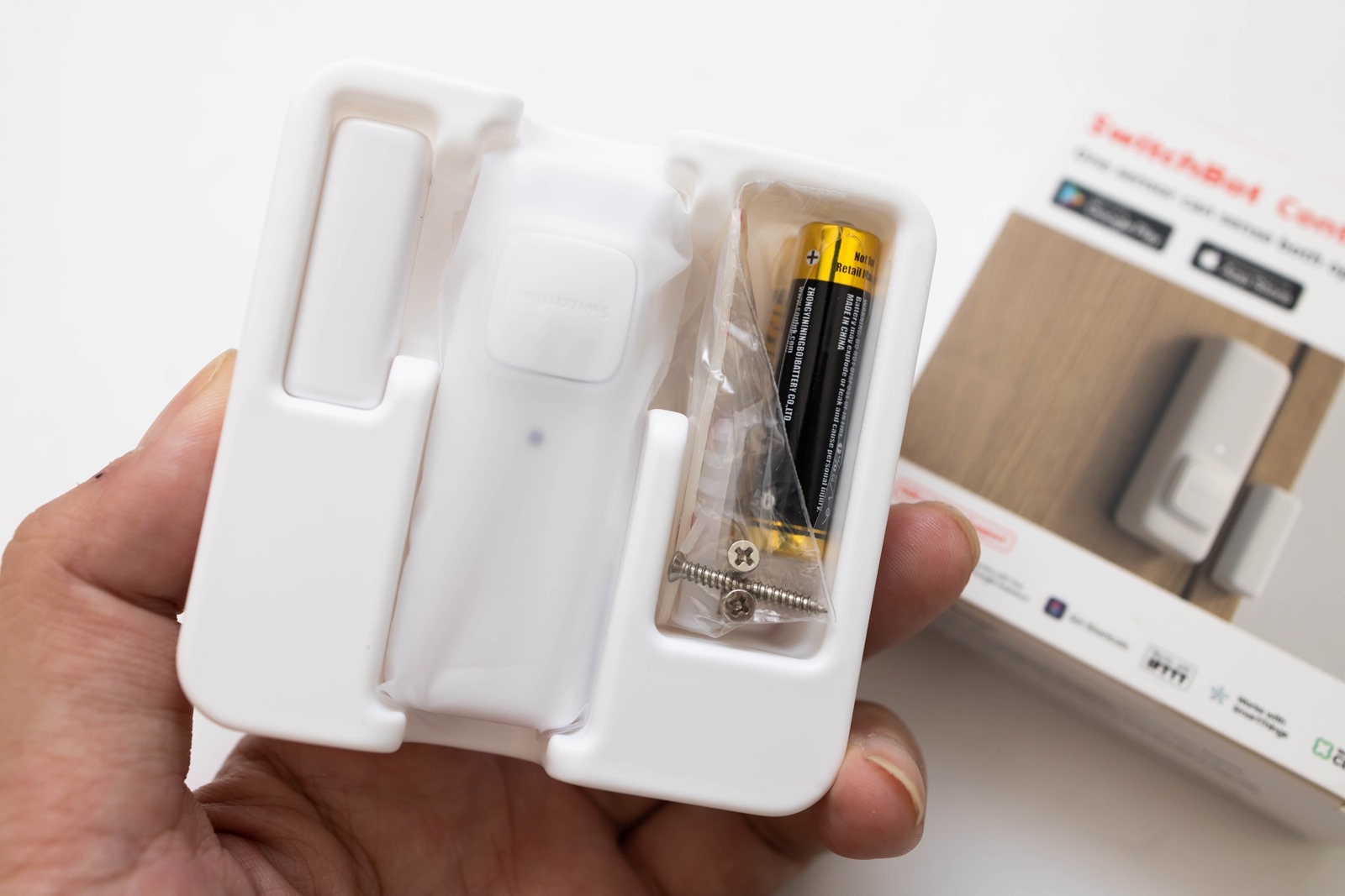 SwitchBot Contact Sensor 門窗感應器,其實就是一個磁簧開關,可以偵測門窗開啟狀況,而且也一樣是無線的設計,因此安裝簡直是無腦太簡單了,私下背後的背膠,直接貼上即可