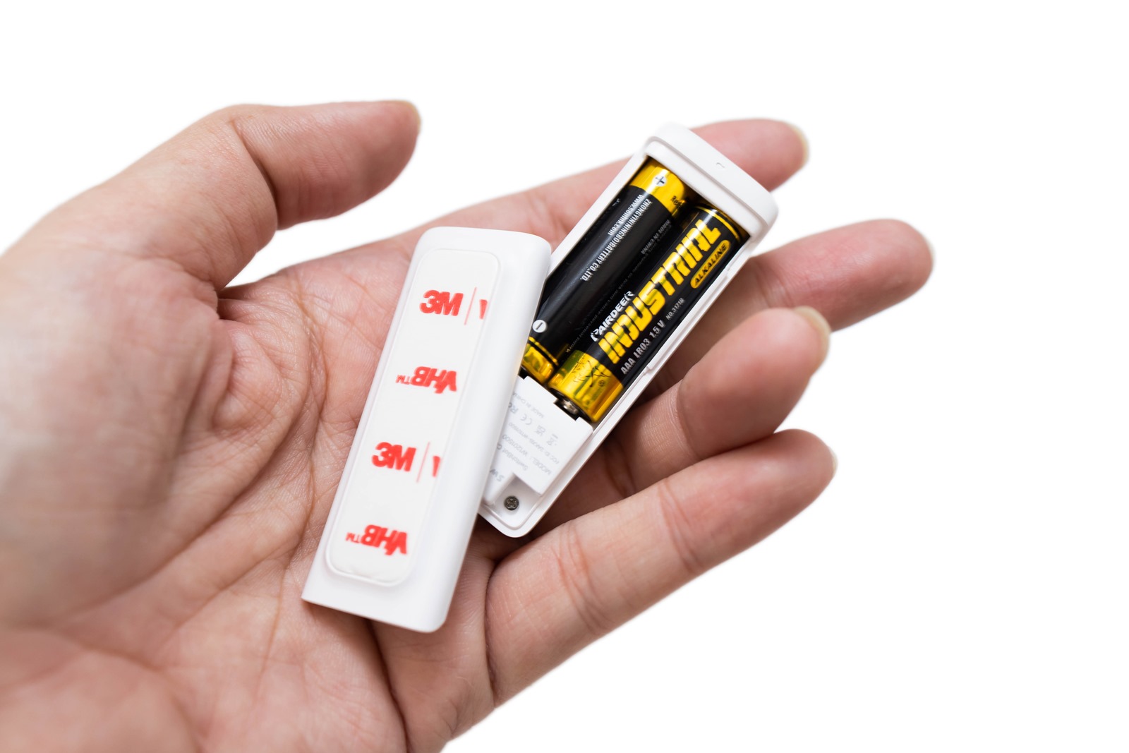門窗感應器需要安裝兩顆 AAA 電池(內附),一般可以使用一年左右非常耐久,快沒電或沒電的情況也會透過 APP 通知告知你該換電池了