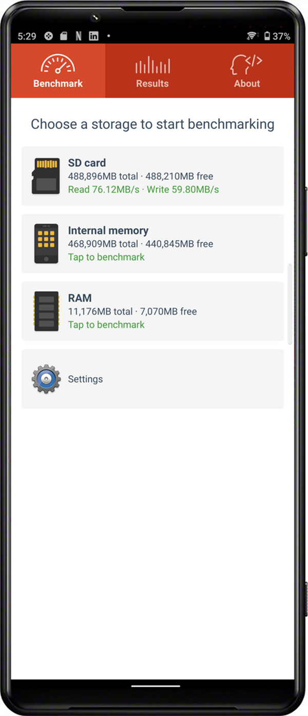 手機測試阿輝在 Sony Xperia PRO-I 上使用 A1 SD 測速軟體,成績讀取約 76 MB/sec,寫入約 59 MB/sec;可用空間約為 488GB 容量。