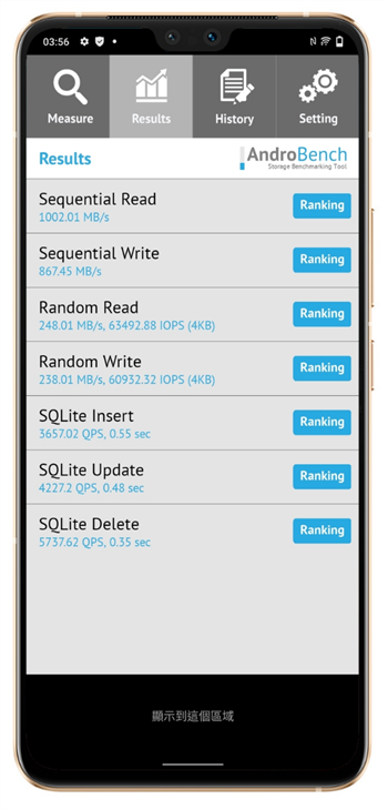 其實除了 CPU 處理器與記憶體,內建儲存空間的讀取/寫入速度也非常影響到日常使用的順暢度,這裡使用 AndroBench 實測讀寫速度,測得的結果為讀取 1002 MB/sec MB,寫入為 867 MB/sec
