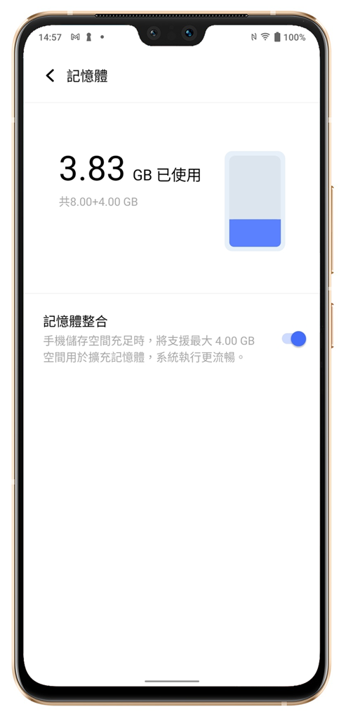 vivo V23 5G 支援了最新記憶體整合技術 2.0,以阿輝手上 vivo V23 5G 來看,可以利用高速儲存空間模擬記憶體,將原本內建 8GB 最多擴充為 8GB + 4GB,讓多工切換可以支援更多應用程式