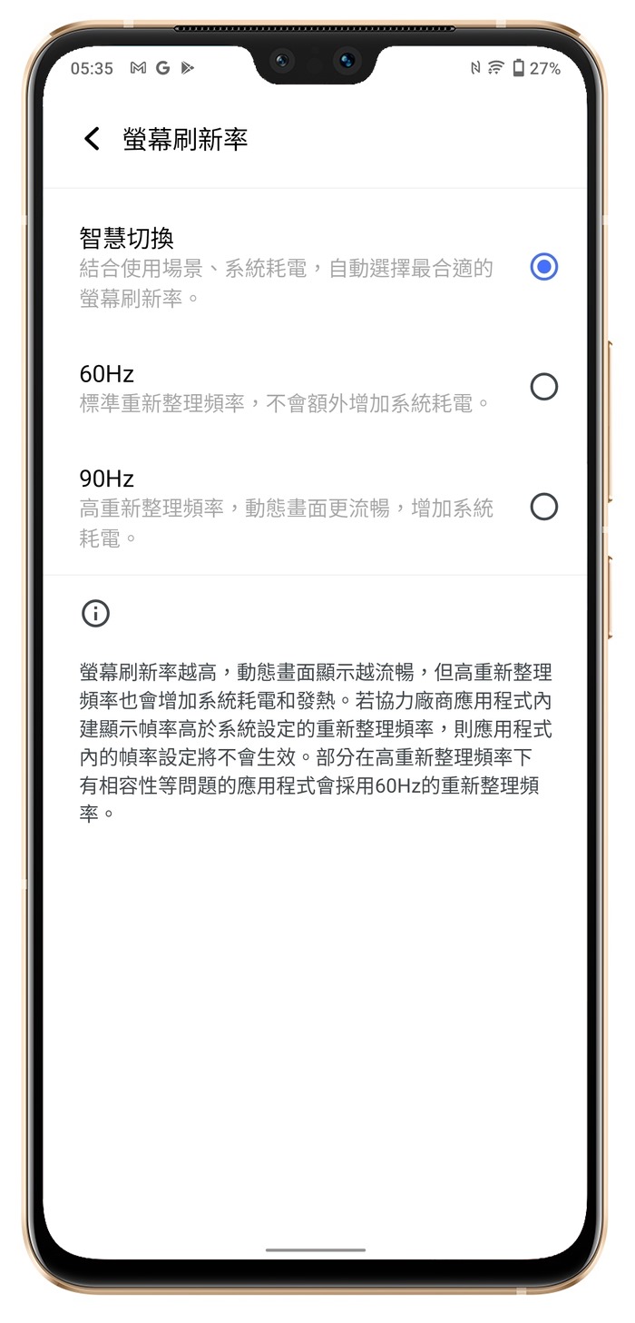 vivo V23 5G 螢幕更新率部分支援最高 90Hz,也支援智慧自動切換模式