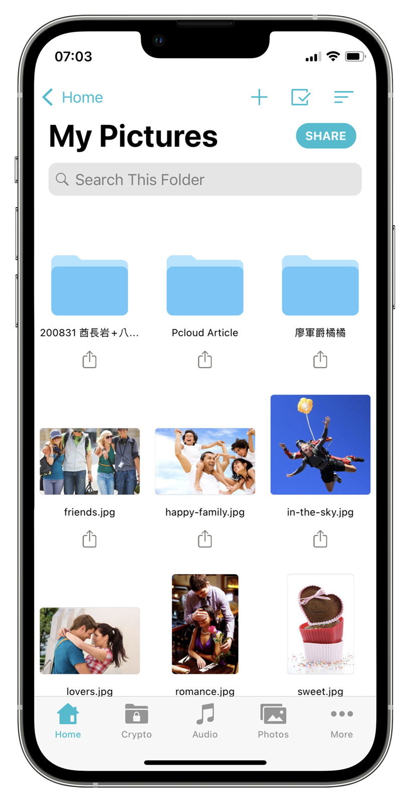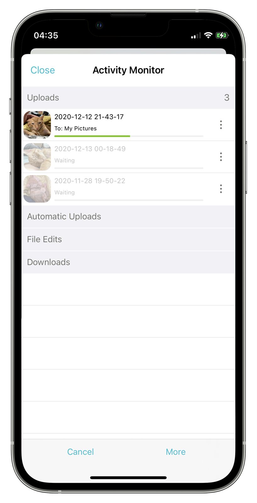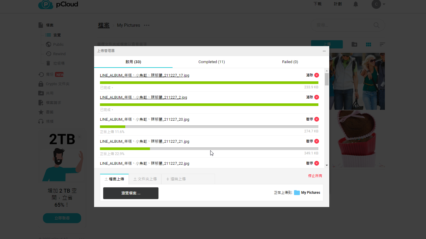 不管是使用手機還是桌機在上傳檔案的時候都可以在背景程式的狀態下執行,不影響同時使用其它功能的狀況,上傳檔也可以手動設定,例如在照片 My Pictures 的資料夾裡可以看到右上方功能列裡的+號,點一下就可以進入選取要上傳的檔案,同時選取多張後再新增或指定上傳的資料夾後就可以開始上傳,就算很多張照片也不擔心,跳出程式也不會停止,只要網路連線存在就會繼續做上傳,並且也支援斷點續傳的功能,不會因為網路狀態改變就打斷備份計劃。