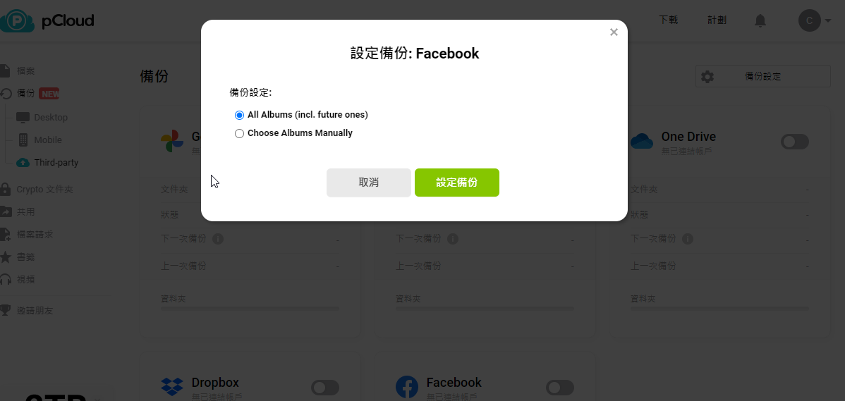 此外除了備份自己使用裝置上的個別內容以外,也能再使用 PCLOUD 備份其它的網路內容,例如 facebook 的檔案相簿,在網頁版的備份功能中可以看到圖示,擔心 facebook 有一天消失或者是系統出錯讓珍貴的使用痕跡消失的話,也可以使用 PCLOUD 來做備份,備份選項同樣有備份全部或者手動指定備份相簿的兩種選擇。