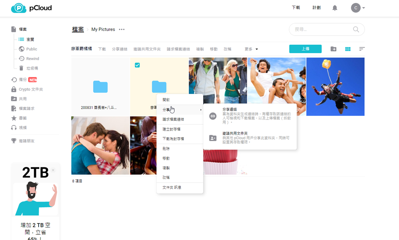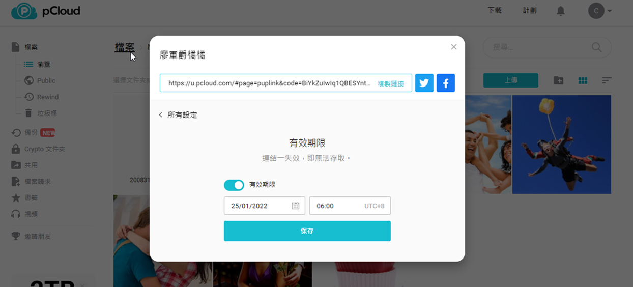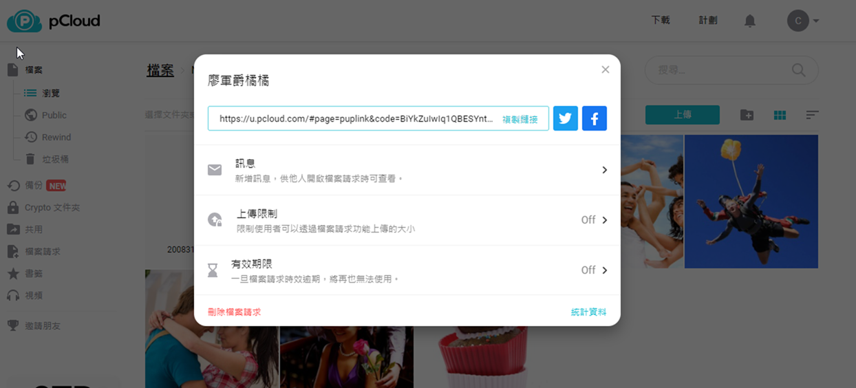 上傳後的檔案想要透過 pCloud 分享給其它人也同樣超級便利,不管是透過網頁版、桌面版和手機版都可以一鍵搞定。網頁版的部份在指定的資料夾或檔案上點一下滑鼠右鍵後可以看到分享選項,可以透過分享連結或者是指定 pCloud 用戶分享資料夾的方式;以連結的方式分享的話可以直接複製連結提供,也可以透過 email 、 twitter 、 facebook 來做分享之外,還能設定資料夾的使用權限:例如是否開放上傳其它檔案、或者僅供檢視或可否下載的權限,甚至是以密碼保護的方式提供,或者設定連結有效期限,等等這樣的細節,都更進一步的讓人在使用 PCLOUD 的分享功能時有更加一成的保護功能在,這點可以說是阿輝覺得非常激賞的功能!