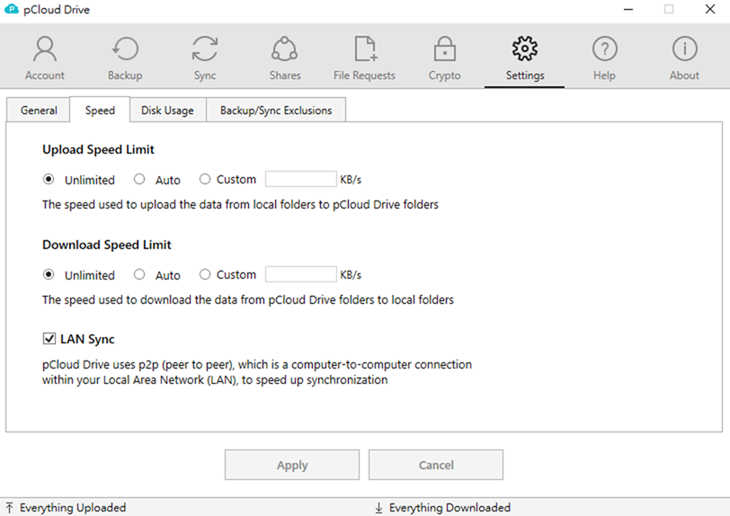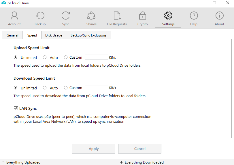 使用 pCloud 的檔案上傳或下載原始設定是不限速的,若希望特別設定限制的話也同樣可以直接在程式中設置流量速度限制。