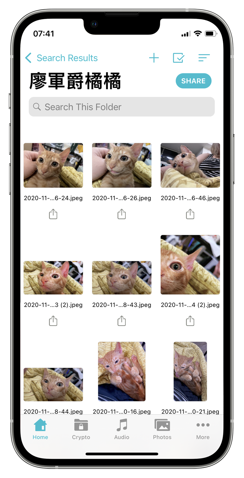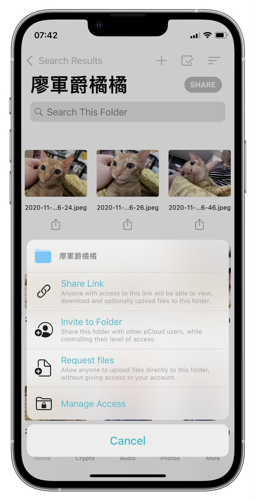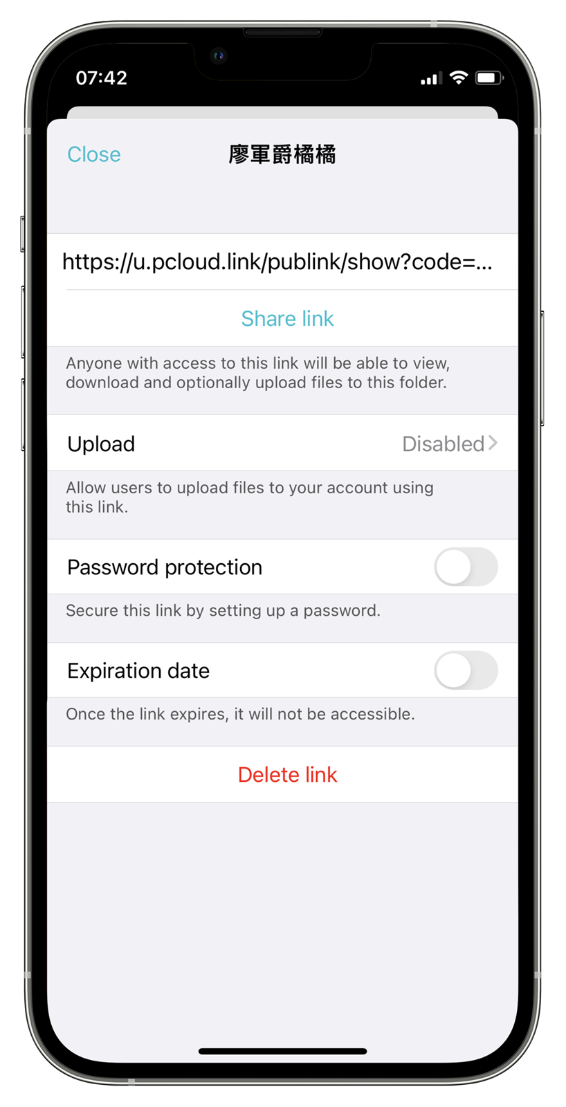 手機版的分享功能也同樣和桌機版、網頁版一樣直覺,選擇想要分享的資料夾在右上角找到 SHARE 的 ICON,點選後就可以看到一樣從桌機版、網頁版可以看到的細節設定,不管是密碼保護、連結刪除、上傳權限等等一個都不少,比起阿輝使用過的其它雲端服務來說直覺性更勝一籌。