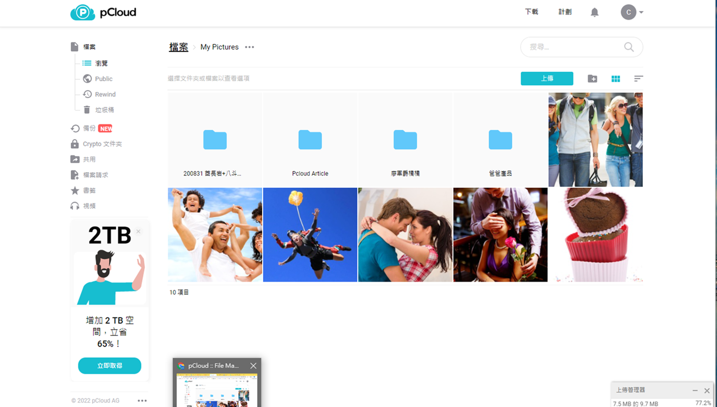 使用網頁上傳備份資料的時候也一樣,第一個會馬上出現上傳管理器的畫面,實時看到上傳的進度,但是若想同時繼續使用雲端服務的其它內容的話,點一下旁邊空白的地方就會看到上傳進度縮小在網頁的右下角,此時想要繼續使用其它功能也是可以繼續進行的,非常適合習慣同一時間進行多項工作的使用者。
