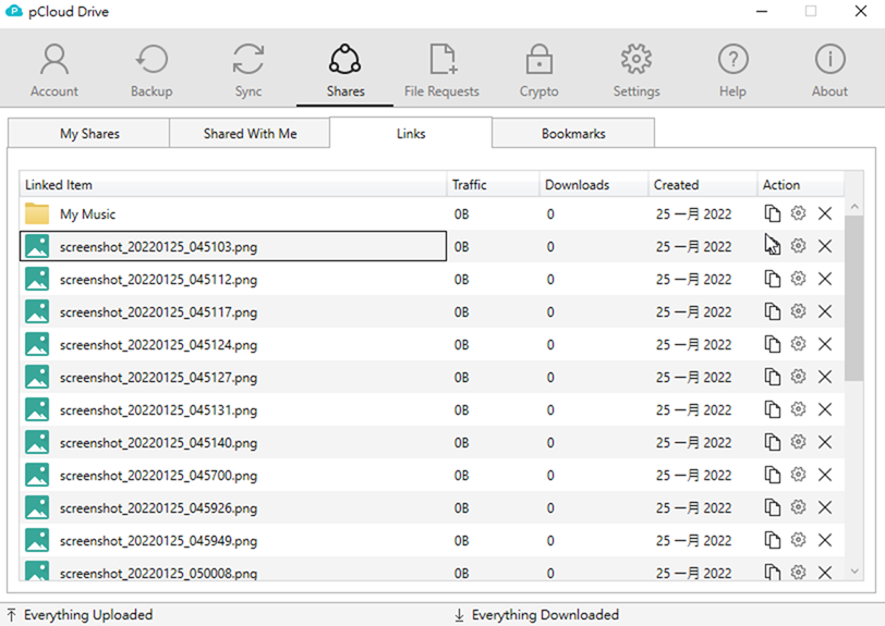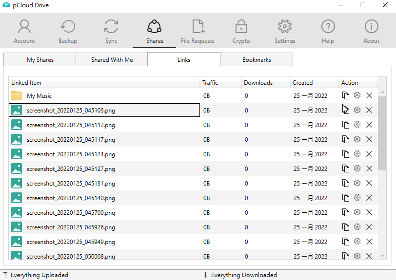 使用桌面機版分享檔案的話,可以選擇從桌面程式或是直接從電腦的虛擬資料夾上選取分享,桌面程式的話則是在 Shares 的 Links 中的 Action 選項底下有可以點一下複製圖示直接產生連結,或者是點選齒輪進去可以看到同樣的分享設定選項細節。