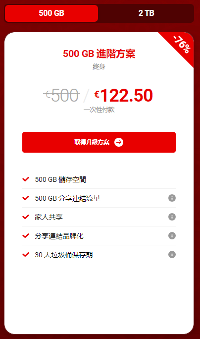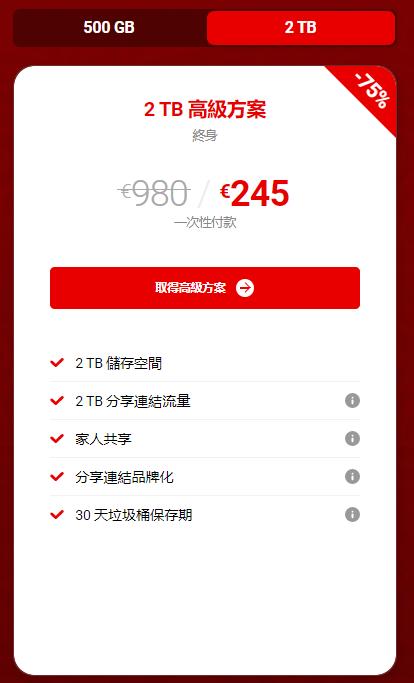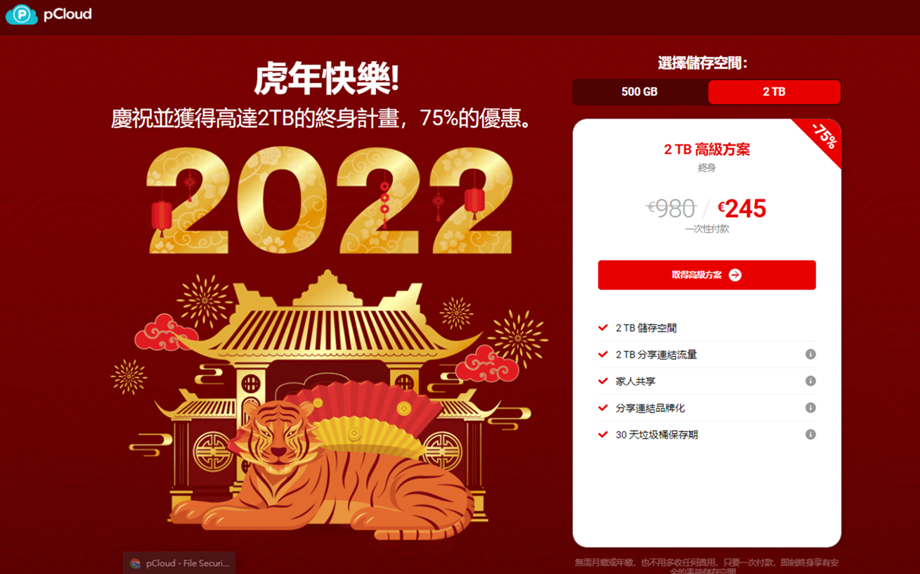 pCloud 現在提供新春開工限時優惠,2TB 的終身方案提供了 75% OFF 的超優惠價格!一次性支付就可以享有終身 2TB 的跨平台雲端服務,不只能自己用還能與家人共享使用!廢話不多說,先提供給大家購買連結,接著再請往下看 pCloud 與 Google Drive 與 iCloud+的簡單價格比較