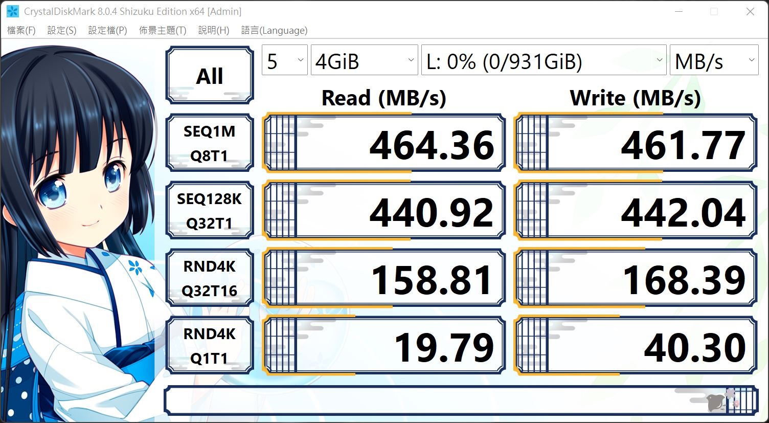速度實測結果,結果為 464MB/sec 讀取,461MB/sec 寫入的成績(電腦端一樣使用支援 USB 3.1 Gen 2 的端口測試)