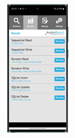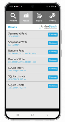 其實除了 CPU 處理器與記憶體,內建儲存空間的讀取/寫入速度也非常影響到日常使用的順暢度,這裡使用 AndroBench 實測讀寫速度。