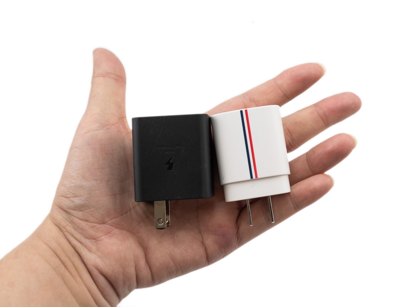 之前的舊版 45W 與 25W 比較(右邊為舊款 45W 充電器,左邊為 25W 充電器)
