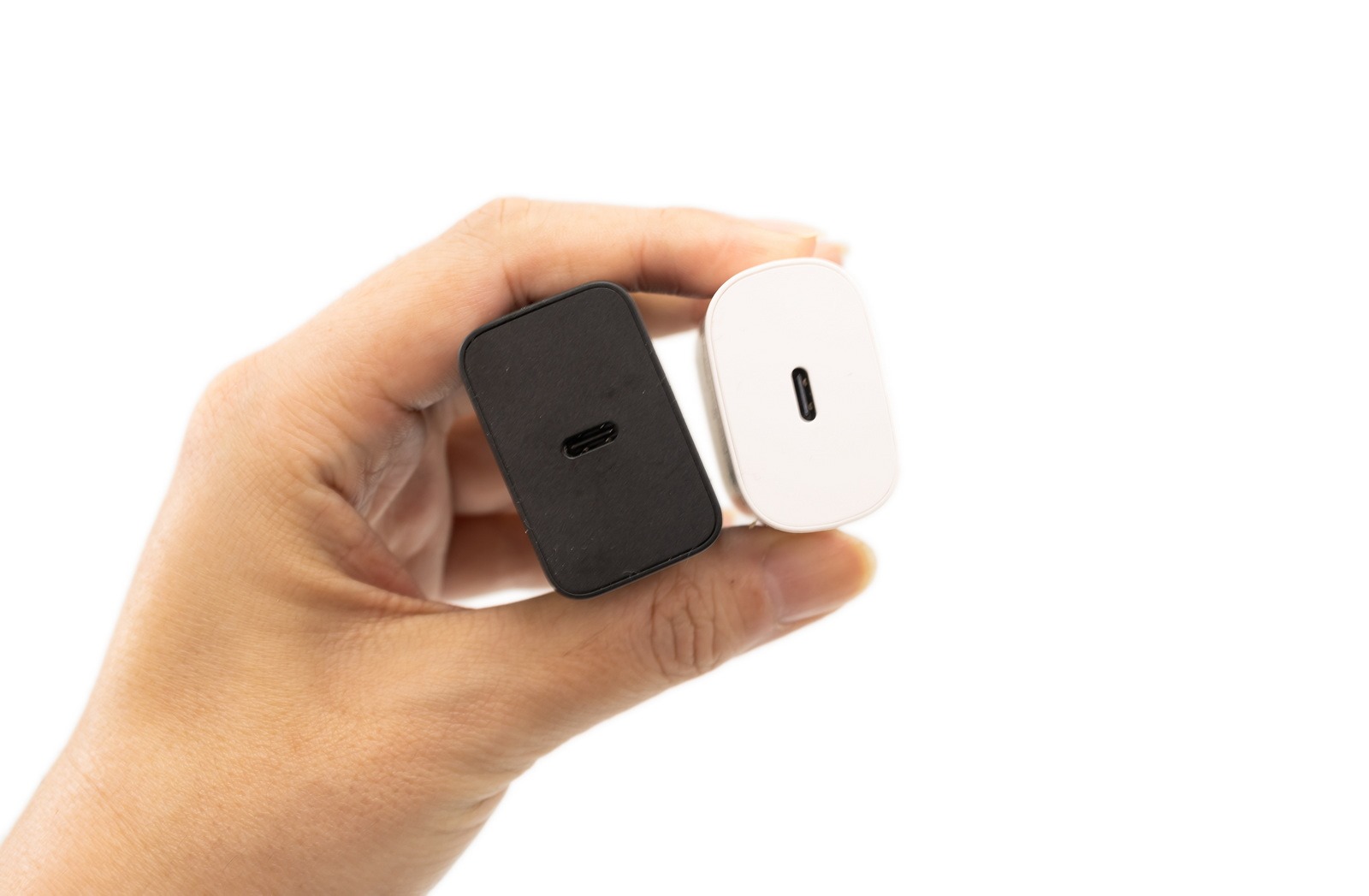 也把新款的 45W 充電器與之前的 25W 充電器比一下大小,真的要說新款的 45W 充電器體積縮小很多,與 25W 充電器相比其實沒有差別很大(左邊為舊款 45W 充電器,右邊為 25W 充電器)