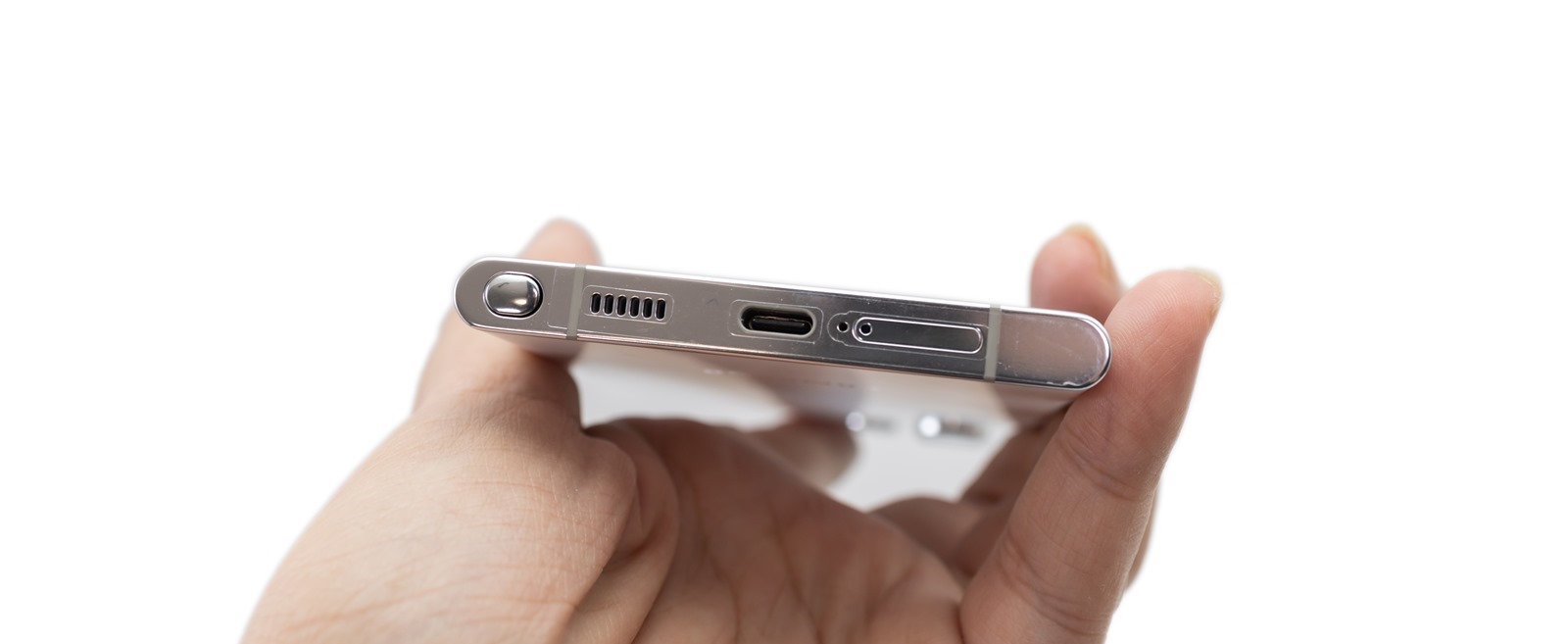 底部為支援 USB 3.2 Gen 1 的 USB C 充電傳輸接口與 SIM 卡插槽,同時立體聲喇叭也位於機器底部,Galaxy S22 Ultra 則在左側有 S Pen 筆槽