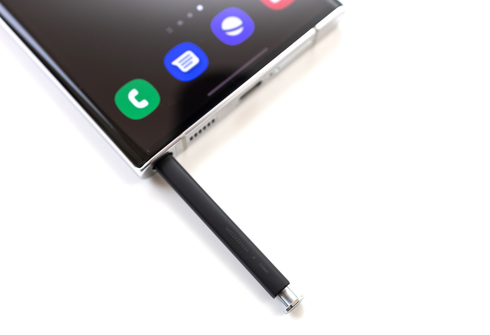 Galaxy S22 Ultra 左下角就是這一次很重點的內建 S Pen 手寫筆設計,一樣按一下就會彈出筆尾可以拿出;這一次 S Pen 筆身台灣上市的機種統一都是消光黑色,只有筆尾和機身顏色同色,而在海外許多國家三星線上商店特供的特殊色則是例如天藍色/灰色則 S Pen 筆身也會是對應的特殊色,比較可惜是台灣目前並沒有引進