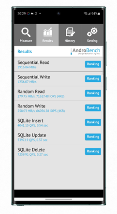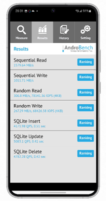 其實除了 CPU 處理器與記憶體,內建儲存空間的讀取/寫入速度也非常影響到日常使用的順暢度,這裡使用 AndroBench 實測讀寫速度。