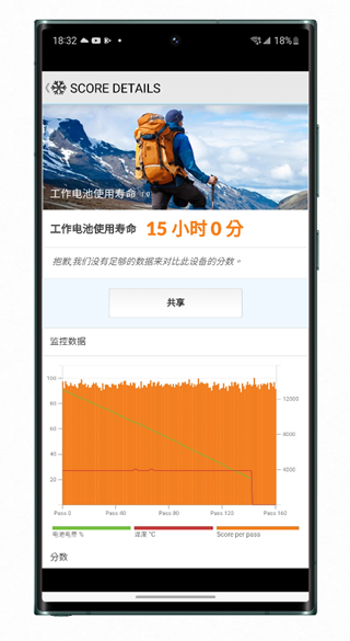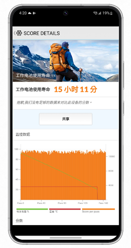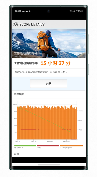 - S22 Ultra 設定更新率為 120Hz 模式 + 解析度 FHD+ 組合,測試結果為 15 小時 0 分鐘