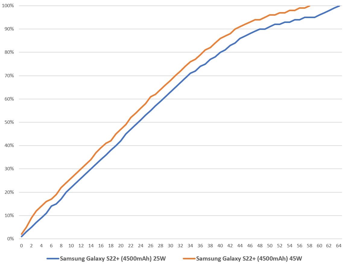 - 45W 充電器充電 10 分鐘後,電力達到 26%,充電 30 分鐘後,電力達到 68%,手機完整充電總共花 64 分鐘時間