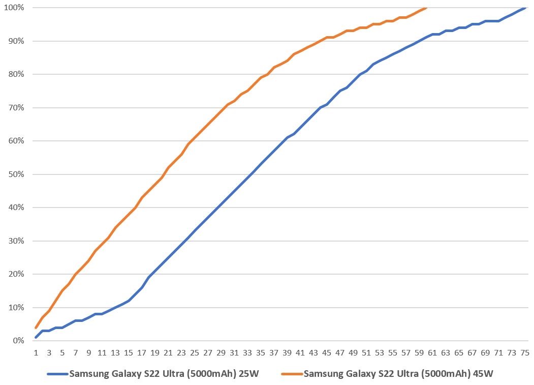 - 25W 充電器充電 10 分鐘後,電力達到 8%,充電 30 分鐘後,電力達到 45%,手機完整充電總共花 74 分鐘時間