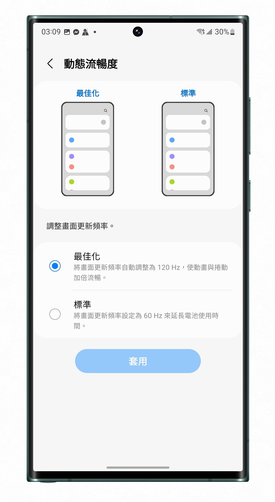 螢幕部分除了 Galaxy S22 Ultra 用上了 WQHD+ 解析度並支援 120Hz 高更新率可以同時開啟,更是支援動態 1~120Hz 的智慧調整,這意味著可以在提供更順暢的顯示的同時也更省電,這在本篇後面一點的電力測試部分也可以獲得證實,基本上建議都可以開啟動態順暢顯示,解析度部分不同的設定才比較會有使用時間的明顯差異。