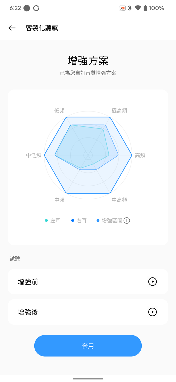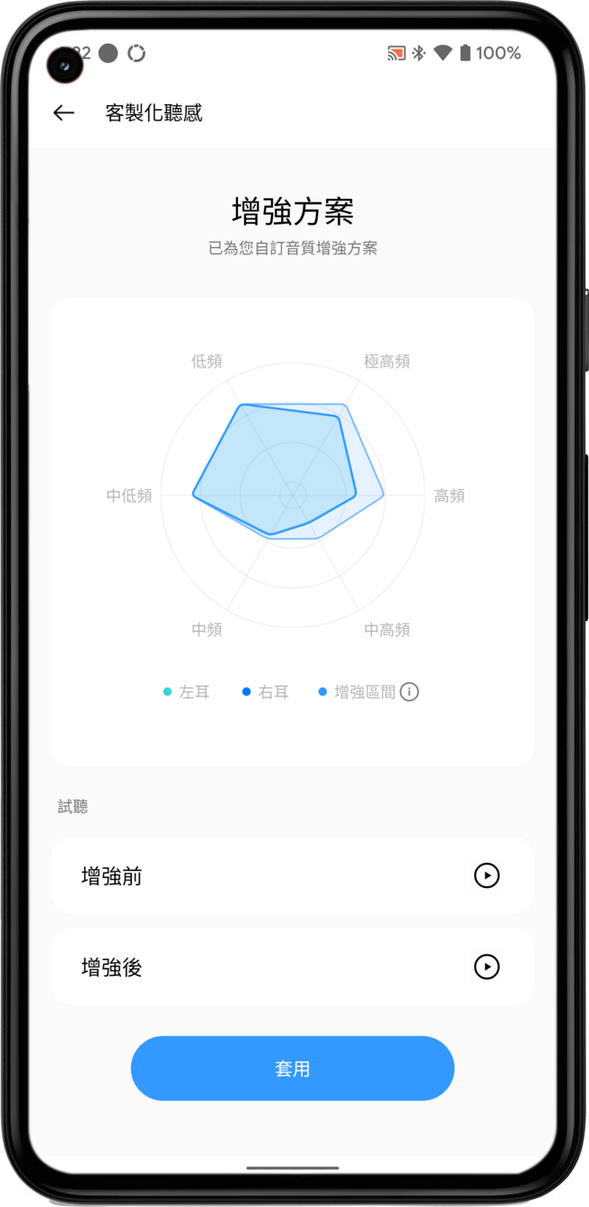 客製化聽感功能可以透過簡單的測試,量測每個人雙耳的聽感,進一步提供最佳化的音效補償效果