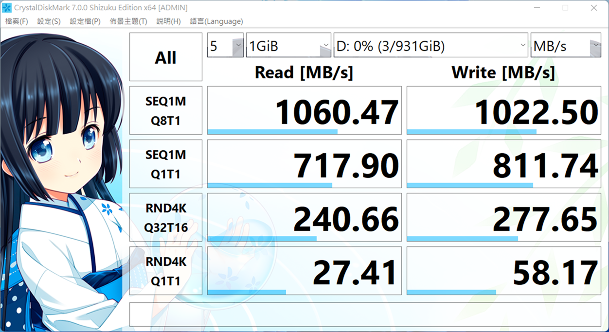 阿輝實測結果也的確可達成 1060MB/sec 讀取,1022MB/sec 寫入的驚人成績!十分不錯!