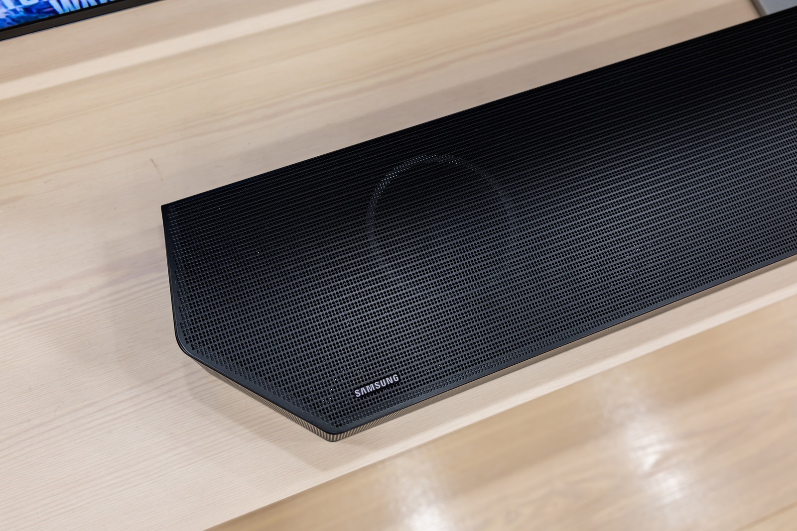 三星 Soundbar 今年採新金屬質感設計,表面可透視設計能看到喇叭單體隱藏在下方