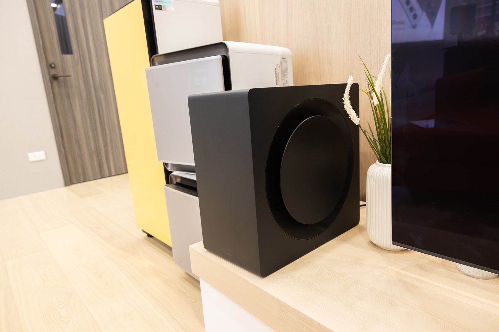 實體開關在向上天空聲道單體的正中間,並還有搭載一顆側邊 2022 全新升級重低音喇叭,加入聲波透鏡技術更強化重低音均衡與乾淨的效果,阿輝在現場實際感受不論是玩遊戲或看電影的聲效,都給人非常棒的沉浸感。