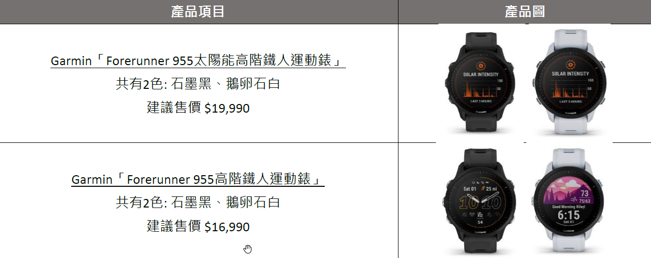 「Garmin Forerunner 955 太陽能高階鐵人運動錶」官網: https://www.garmin.com.tw/minisite/forerunner/forerunner-955/